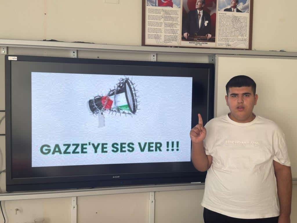 7 Ekim Salı sabahı Filistin'deki insan hakları ihlallerinin sona erdirilmesine yönelik kararlı desteğimizi somut biçimde göstermek ve gençlerin insan hakları ile demokratik duyarlılığını, ortak sorumluluk bilincini en üst düzeyde pekiştirmek amacıyla okulumuzda etkinlikler düzenledik. Bu etkinliklerle Filistin Halkı'nın yanında olduğumuzu göstermeye çalıştık. İsrail'in filistin'e olan saldırılarını esefle kınadığımızı bildiririz.